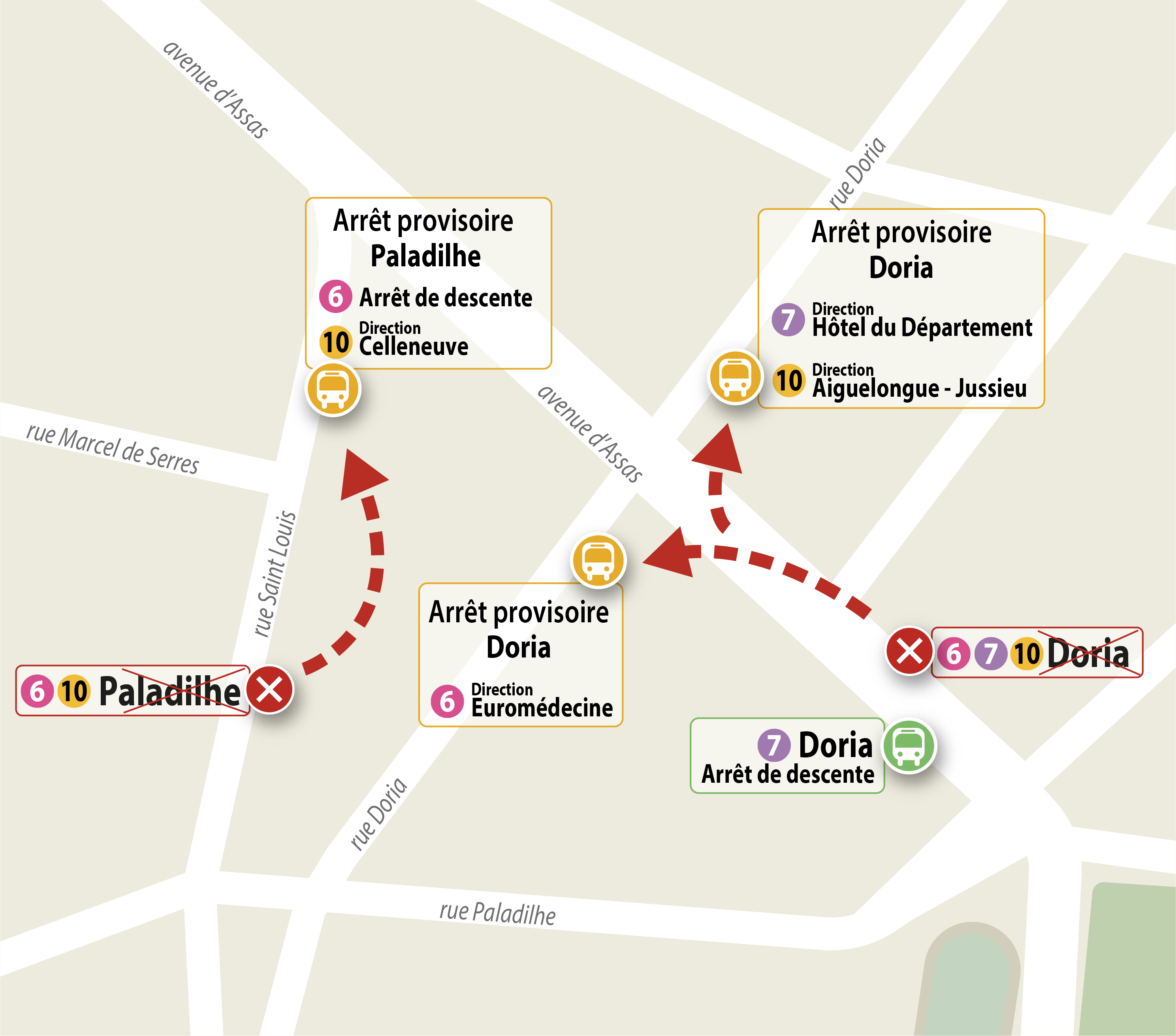 En raison de travaux de voirie rue Paladilhe, les lignes 6, 7 et 10 sont déviées.