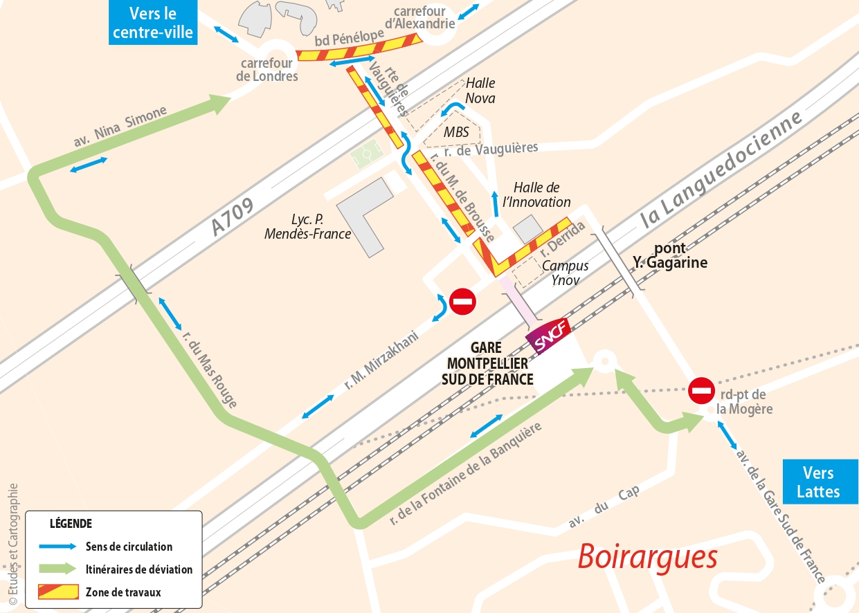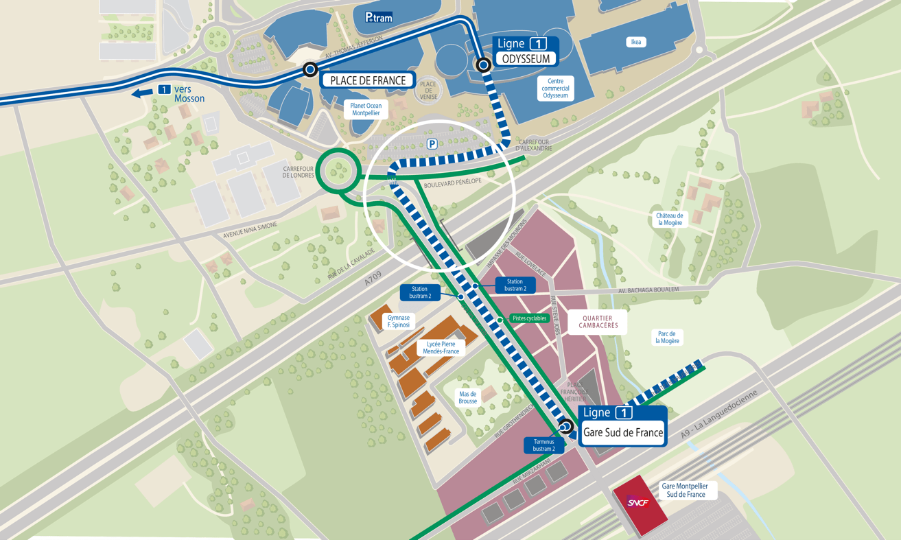 - Desservir la gare Montpellier Sud de France en ligne 1 et ainsi réduire le temps qui la sépare du centre-ville à 20 minutes. Un parcours assuré jusqu’à la mise en service de l’extension par la Navette Gare.