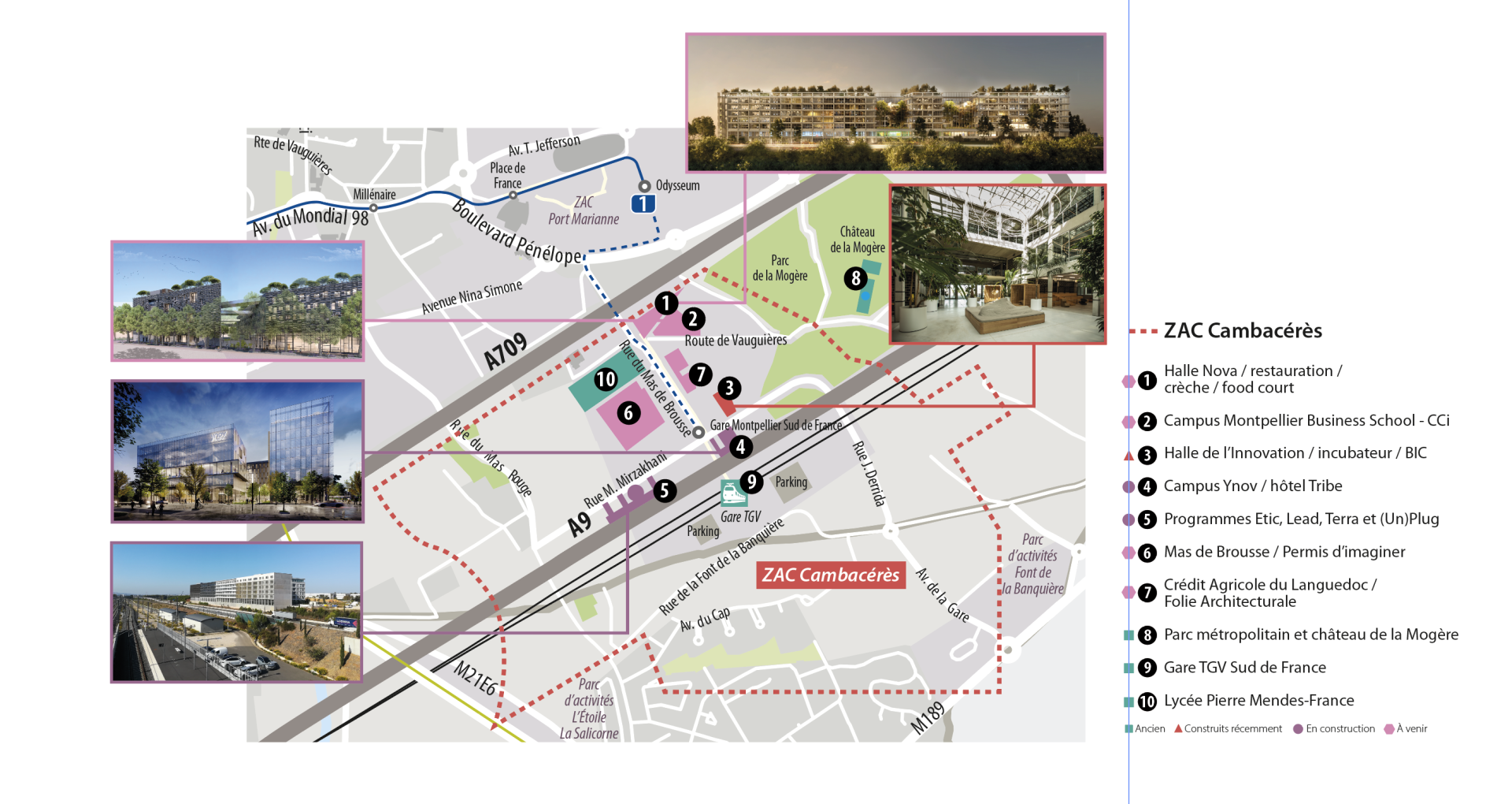 Cambacérès est le nouveau quartier d'affaires tourné vers l'innovation et l'avenir, en cours de construction, à Montpellier. Exemplaire et résolument engagé vers les transitions, il s'agit d’un quartier mixte qui mêle - sur une surface de 60 hectares dont 30 hectares dédiés au Parc de la Mogère - des pôles d'accueil pour les entreprises, des lieux de formation et des lieux enrichissant l'offre événementielle et l'animation de la Métropole montpelliéraine.